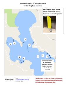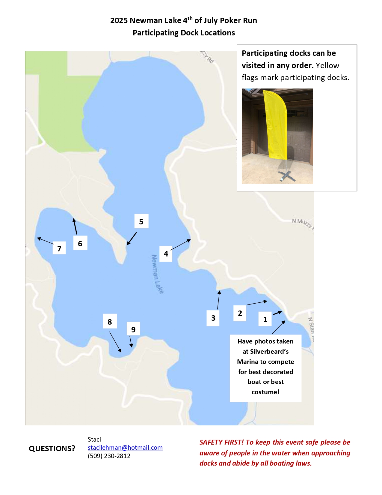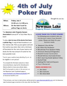 The annual Newman Lake Fourth of July Poker Run, sponsored by the Newman Lake Property Owner’s Association, is Friday, July 4 from 11:30 a.m. to 2:00 p.m. Click the flyer to the left to view the details full size and see the map of participating docks. I